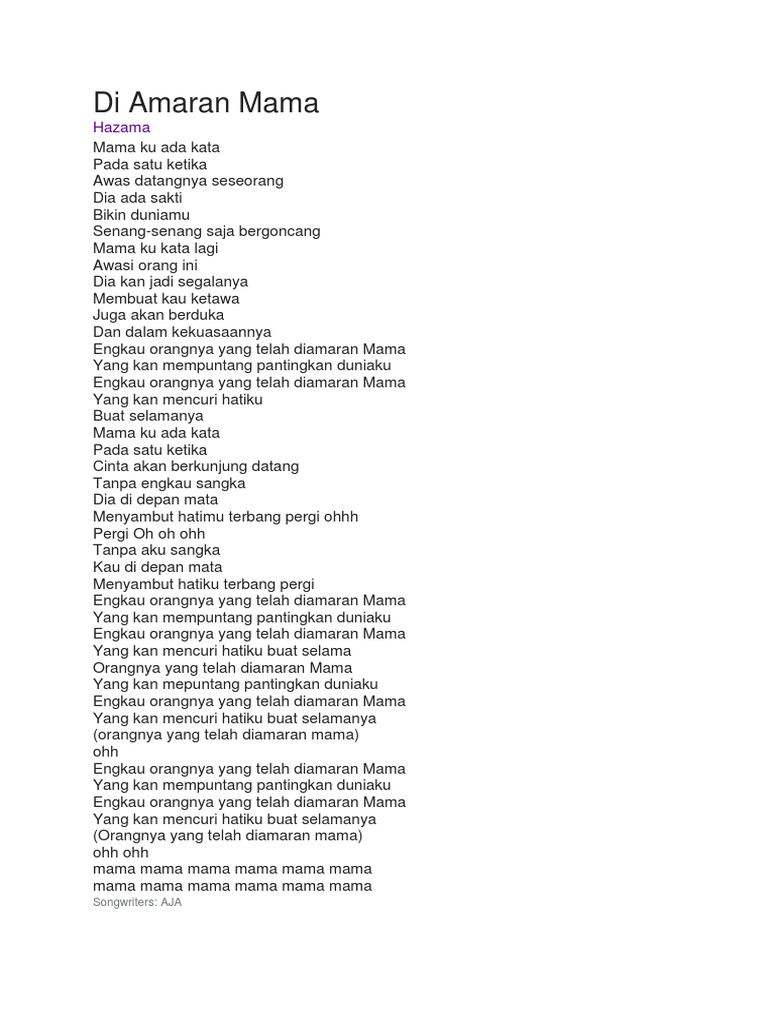 . Credit to both parties. Engkau orangnya yang telah di amaran mama Yang kan menpuntang-pantingkan duniaku Engkau orangnya yang telah di amaran mama Yang kan mencuri hatiku buat selamanya Mamaku ada kata Pada satu ketika Cinta akan berkunjung datang Tanpa engkau sangka Dia di depan mata. Lirik Lagu Di Amaran Mama Hazama.
